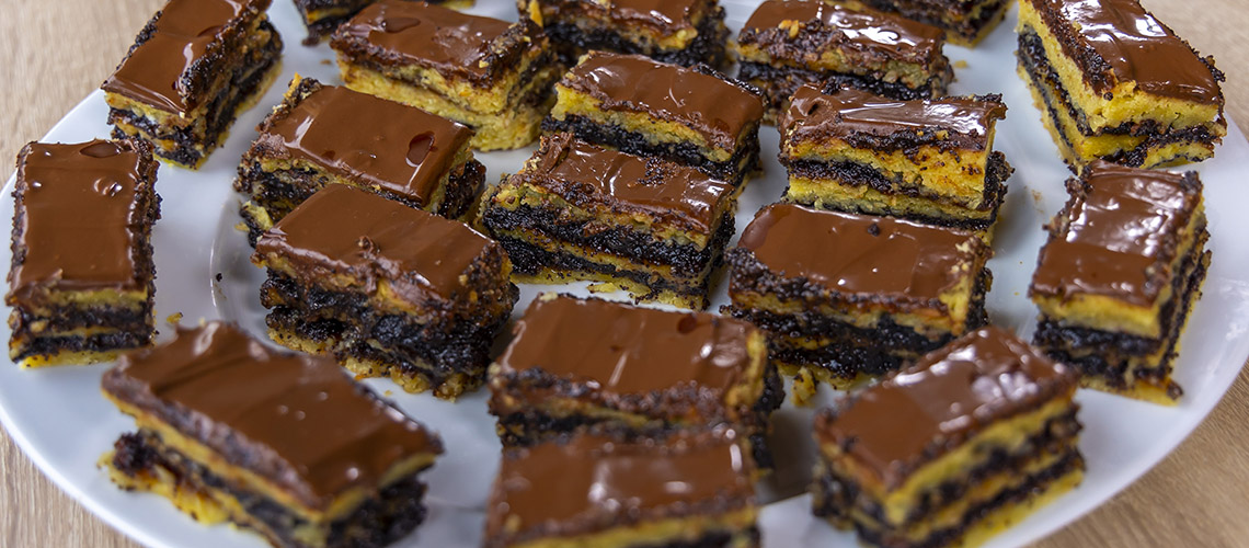 Mikor jól összedolgoztuk és kigyúrtuk a tésztát, akkor három egyenlő részre szedjük. Egy tepsibe sütőpapírt teszünk, és sodrófával az egyik csomagból egy tésztalapot képezünk, és betesszük a tepsibe. Ízlés szerinti lekvárral megkenjük, Margóék eper és szilva lekvárt kevertek össze. Majd két marék mákot is elterítünk a lekváron. Csokireszeléket szórunk rá – akár lehet fehér és normál keverék is – majd mézet. Egy kis olajjal meglocsoljuk a mákot. Ezután még egy réteg tészta jön, arra dió, majd még egy zárólap. Megsütjük, és mikor a sütőből kivesszük csokoládét olvasztunk a tetejére.