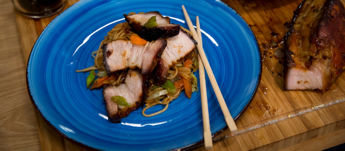 Szójaszószból, chiliből, cukorból, gyömbérből, fokhagymából és mézből pácot készítünk és beleforgatjuk a húst. (Optimálisan egy éjszakát hűtőben pihentetjük). A császárt 90 percig hőkezeljük a 180 fokos sütőben. Hagyjuk kihűlni, vékony szeletekre vágjuk. A zöldségeket felcsíkozzuk, megpirítjuk, hozzáadjuk a főtt kínai tésztát, a vékonyra felszeletelt húst és meglocsoljuk a sült hús levével.