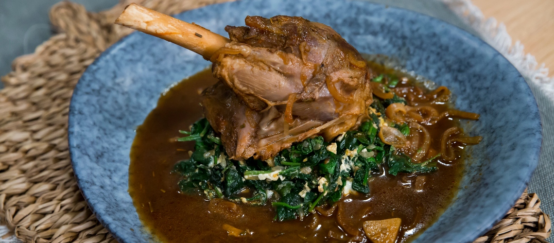 Fűszerezzük és körbepirítjuk a csülköt. Felvágjuk a hagymát, a húsos serpenyőben paradicsompürével és kevés cukorral megpirítjuk. Kakukkfüvet és rozmaringot adunk hozzá, majd a csülökkel együtt fedett edényben, a barnasörrel felöntve hőkezeljük megpuhulásig. Hagymán és fokhagymán megpároljuk a spenótot, felvert tojást keverünk bele. A hússal tálaljuk.