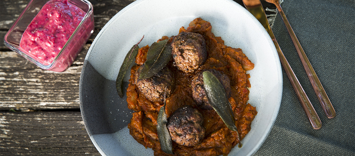 Rámorzsoljuk a kakukkfüvet és a felvagdosott zsályát. Miután minden ízesítő elem rákerült, alaposan összegyúrjuk a húst és gombócokat formázunk.