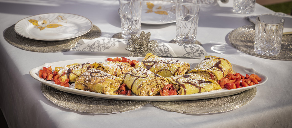 A töltelékhez a túróba keverjünk a cukort, a vaníliás cukrot, a tejfölt és belereszeljük a citrom héját. A palacsintát megkenjük mogyorókrémmel és a túrós töltelékkel, majd friss, apró kockára vágott eperrel megszórjuk. Óvatosan feltekerjük, és mikor teljesen kihűlt nagyobb szeletekre vágjuk. Porcukorral és eperrel díszítve, esetleg csokiöntettel meglocsolva tálaljuk.