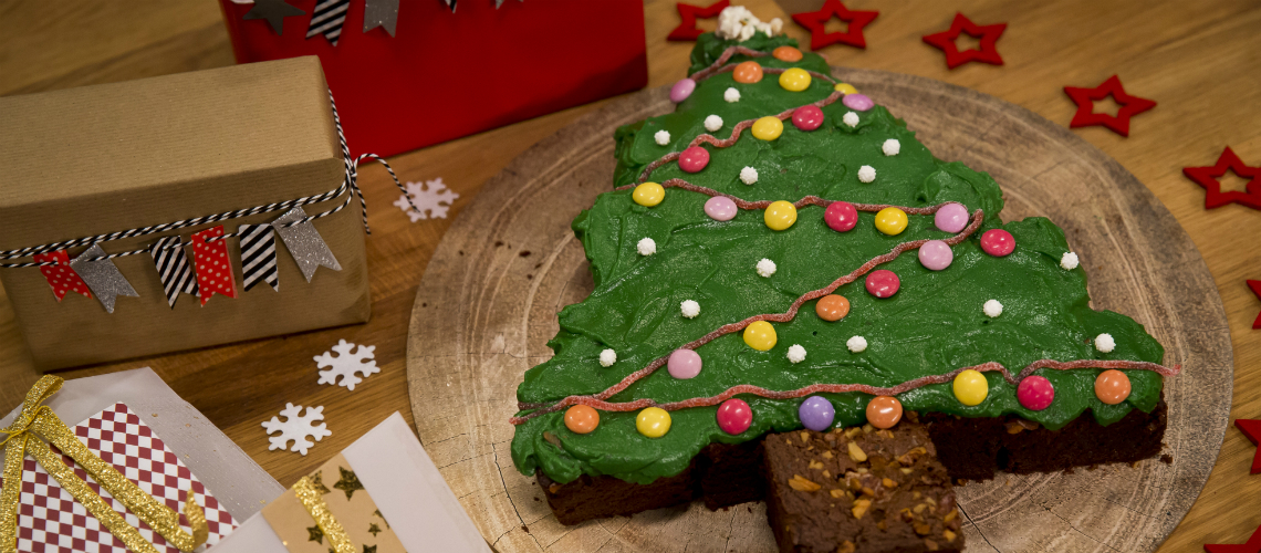 A vajat a csokival megolvasztjuk. A tojásokat a cukorral kihabosítjuk. A kettőt összekerverjük és beleforgatjuk a lisztet. Tepsibe tesszük, megszórjuk a dióval. Ha megsült, kis kockákra vágjuk és karácsonyfa alakban egy tálcára tesszük. Kidíszítjük a fát.