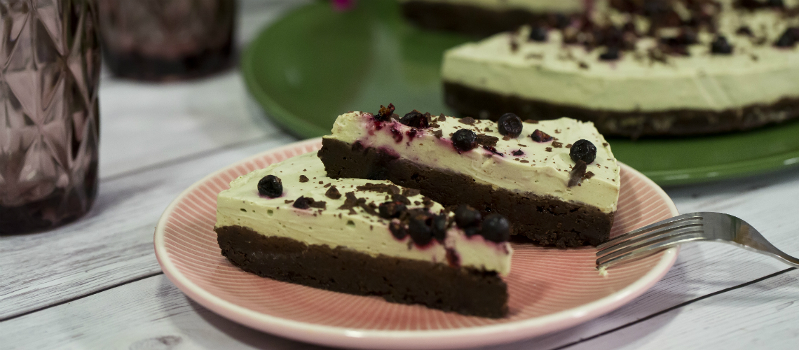 A piskótához az étcsokoládét vajjal vízgőz felett megolvasztjuk. Hozzáadjuk a tejszínhabot, a nádcukrot, a kókuszcukrot, a kakaót és a tojást, végül belekeverjük a rizslisztet is és alaposan összekeverjük. A tésztát egy sütőpapírral kibélelt tortaformába öntjük, melynek oldalát is kikentük vajjal. Előmelegített sütőben sütjük kb. 20 percig, 170 fokon. A megsült piskótát hagyjuk kihűlni, és közben elkészítjük a krémet. Ehhez a turmixgépben a tejszínhabot keményre verjük, majd hozzáadjuk a mascarponét, a mézet, a citromlét és a matcha port. Alaposan összemixeljük. A krémet rákenjük a kihűlt piskótára, és liofilizált ribizlivel, valamint étcsokoládé forgáccsal díszítjük.