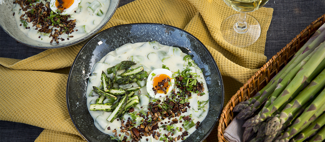 A spárgát megtisztítjuk, felkarikázzuk, megpirítjuk és felöntjük az alaplével és egy korty fehérborral. Sózzuk, borsozzuk és kb. 10 perc alatt puhára főzzük – a színe maradjon élénk zöld!