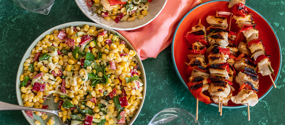 A salátához elkészítjük az öntetet: összekeverjük a joghurtot a mézzel és a lime levével. Hozzáadjuk az összetört fokhagymát is és megsózzuk. A kukoricát salátástálba tesszük a feldarabolt cukkinivel, kápiapaprikával és az összetépkedett bazslaikommal, majd összeforgatjuk az öntettel.