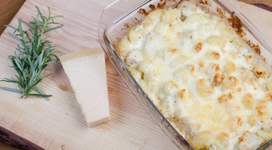 A csirkemellet harapásnyi darabokra vágom. A platnira teszek egy közepes méretű hőálló tálat, kevés olajat öntök bele, majd a húst kicsit megkérgesítem, lepirítom rajta. Amíg pirul, addig hozzáadom az apróra vágott rozmaringot, a vajat, sózom, borsozom, ha kedvem tartja még egy gerezd fokhagymát is adok hozzá. Amikor már elkezdett pirulni a hús, akkor hozzáadom a konyhakész gnocchit is és folyamatos kevergetés, mozgatás mellett a krumpligombócokat megkapatom. Végezetül a húsos gombócokhoz adom a tejfölt, átkeverem, sajtot reszelek a tetejére és a 180 fokra előmelegített sütőbe tolom. Addig sütöm, amíg a sajt szépen meg nem színesedik a tetején.