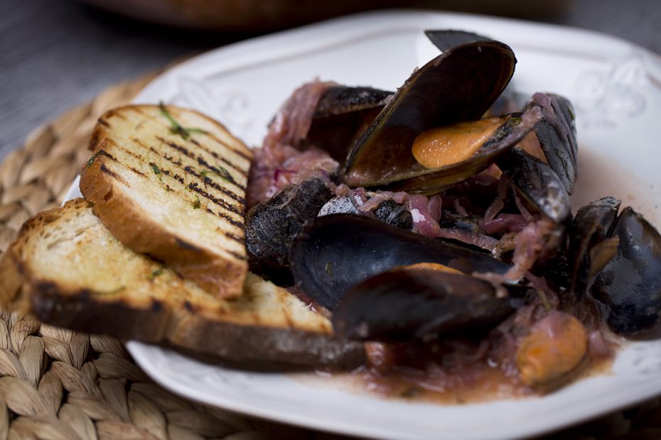A hagymát és az almát megfuttatjuk zsiradékon, meglocsoljuk borecettel, beledobjuk a fokhagymát, valamint a petrezselymet, és tovább pároljuk. Beletesszük a kagylót. Néhány perc párolás után meglocsoljuk fehérborral, és pirítóssal tálaljuk.