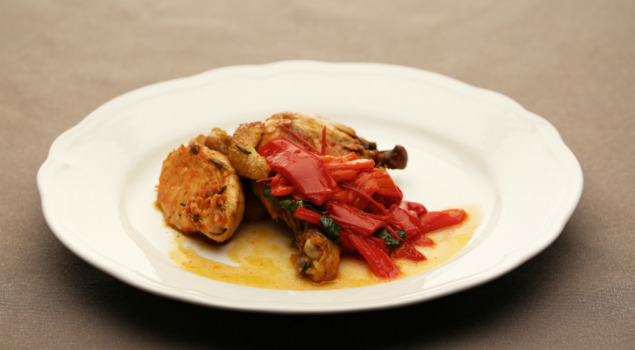 Hosszú, vékony szeletekre vágjuk a paprikát. Olívaolajat öntünk a serpenyőbe, belerakjuk a paprikát, a fokhagymát, a bazsalikomot és ízlés szerint megsózzuk. Lassú tűzön főzzük, néha megkavarjuk. Amikor már kezd puhulni a paprika, hozzáadjuk a cukrot és a vörösborecetet, és fedő nélkül készre sütjük.