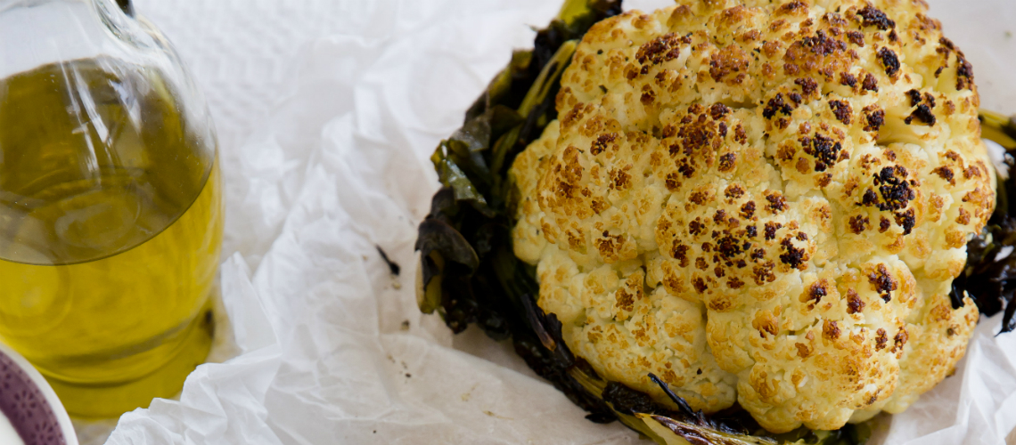 Az előfőzött karfiolfejet helyezzük egy sütőpapírral borított tepsire. Locsoljuk meg 2-3 evőkanál olívaolajjal. Tegyük be a sütőbe, és süssük 35 percig. Ezt érdemes kitapasztalni, a pontos sütési idő sütőfüggő. Akkor jó, amikor egyenletesen megpirult, és egy-két sötétebb, karamellizált folt is van rajta. Egészben tálaljuk, mellé kis tálkákban adhatunk tejfölt, joghurtot, salátákat, chiliszószt, pirított mogyorót vagy kesudiót.