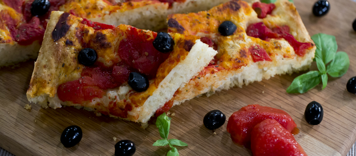 A burgonyát feltesszük főni. Amikor megfőtt, összetörjük a krumplit, hozzáadjuk a lisztet, a sót és cukrot. Az élesztőt langyos vízbe tesszük. Kikenjük a tepsit, a tésztát beletesszük és kelni hagyjuk, amíg duplájára nő. Kisebb darabokra vágjuk a paradicsomot, majd a fekete olívabogyókkal együtt beletesszük a tésztába. Sütőben 30-40 percig sütjük, 190-210 fokon.