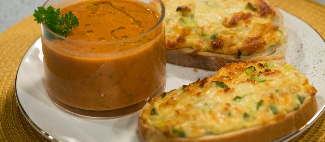 Tálaláskor teszünk rá sült kenyérkockákat, apróra vágott uborkát, kápiát, paradicsomot, egy kis oliva olajat csurgatunk rá. ízlés szerint egy darab jeget is beletehetünk tálaláskor.