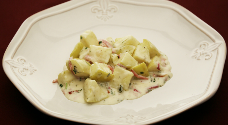 Egy serpenyőben megmelegítjük a vajat és megpirítjuk benne a szalonnát. Belerakjuk a nagyobbacska kockákra vágott almát (héjastól), a gorgonzolát és a mascarponét, valamint a tejszínt. Közepes lángon krémesre főzzük. A legvégén beleszórjuk az aprított petrezselymet, és sózzuk, borsozzuk ízlés szerint.