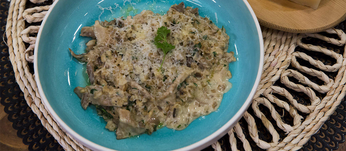 Az gerslit sós vízben puhára főzzük. A vajon megpirítjuk a hagymát és hozzáadjuk a gerslit. Felöntjük alaplével. A gombát a hagymán szárazra pirítjuk, megfűszerezzük és hozzáadjuk a gerslihez. Tejszínt adunk hozzá és mikor elzárjuk, még egy kis vajat és parmezánt keverünk bele. Tálaláskor petrezselyemmel megszórjuk.