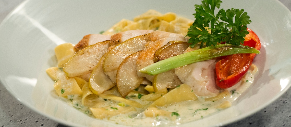 A tésztát kifőzzük, majd a kész mártásba forgatjuk. A körtéket vágjuk csíkokra és pirítsuk meg serpenyőben.