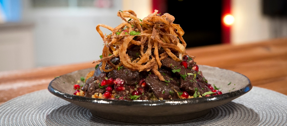 HAGYMÁS GRÁNÁTALMÁS CSIRKEMÁJ ZÖLDSÉGES KUSZKUSSZAL, FRANCIA SÜLT HAGYMÁVAL