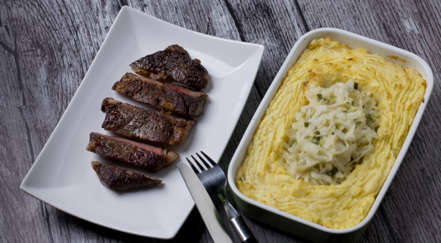 A burgonyát megpucoljuk, kockákra vágjuk és sós vízben megfőzzük. A káposztát vékony csíkokra vágjuk és enyhén sós vízben szintén megfőzzük és lecsöpögtetjük. Az apróra vágott újhagymát a főtt káposztával együtt tejszínben és húsalaplében néhány perc alatt összeforraljuk és sózzuk, borsozzuk. Az áttört krumpliba kevés vajat teszünk, belekeverünk egy tojás sárgáját, majd egy hőálló edénybe úgy formázzuk bele, hogy a közepén hagyunk egy nagyobb mélyedést. Néhány percre 200 fokos sütőbe tesszük, hogy megpiruljon a teteje. Tálaláskor a közepébe szedjük a tejszínes káposztát. Olvasztott vajjal locsoljuk.