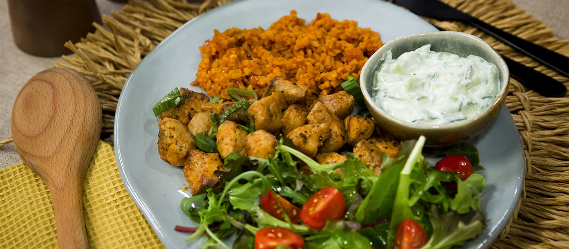 A tzatzikihez az uborkát lereszeljük, megszórjuk sóval és hagyjuk állni kb. 10 percig. Addig összezúzzuk a fokhagymát és kikeverjük a joghurttal. Az uborka levét kinyomkodjuk, hozzákeverjük a fokhagymás joghurthoz, fűszerezzük fehérborssal és krémesítjük egy kevés olívaolajjal. Megkóstoljuk és ha szükséges, sózzuk.