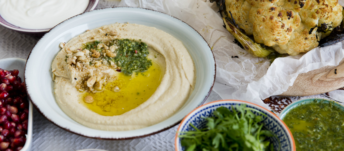 A csicseriborsót előző este háromszoros mennyiségű hideg vízbe áztatjuk. Másnap leöntjük róla a vizet, és egy nagy lábasban friss vizet, valamint egy kávéskanál szódabikarbónát adunk hozzá, ez felgyorsítja az egyébként hosszú főzési időt. Kb. 45 perc alatt teljesen puhára főzzük. A puha csicseriborsót leszűrjük, Az összes többi hozzávalóval robotgépbe tesszük és krémesen simára pürésítjük. Ha túl sűrű, hozzáöntünk egy kevés hideg vizet. A chiliszószhoz aprítógépbe teszünk mindent és pürésítjük. Tálaláskor a humuszra kanalazzuk.