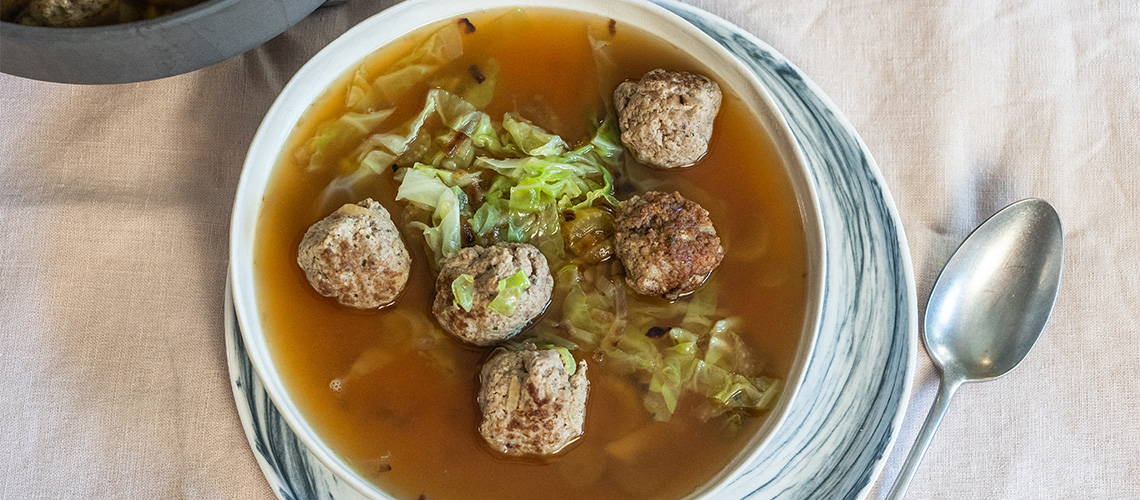 Felöntjük az alaplével, 5 percig fedő alatt főzzük. A vékonyra szeletelt kelkáposztát csak a legvégén adjuk hozz, éppen csak blansírozzuk a levesben, majd azonnal tálaljuk.