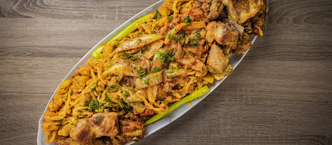 Összeállítjuk az ételt: a tésztához adjuk a paprikás krumplit, majd a lecsót.