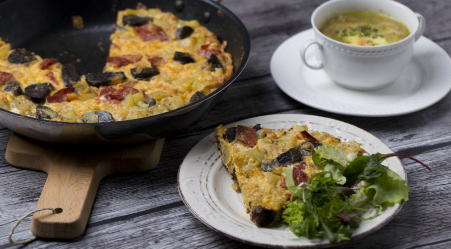 A nagyobb kockára vágott vöröshagymát olajban lepirítjuk, majd hozzáadjuk a szintén kockázott burgonyát. Sózzuk, borsozzuk. Miután a burgonya megpuhult hozzáadjuk a sült, kockázott hurkát, a darabolt chorizo kolbászt és a főtt babot. Alaposan összeforgatjuk, majd ráöntjük a felvert tojásokat. Lassú tűzön megsütjük az alját és előmelegített 180 fokos sütőben megsütjük a tetejét is. Tálaláskor vörösborecetes, olívás salátaleveleket kínálunk mellé.