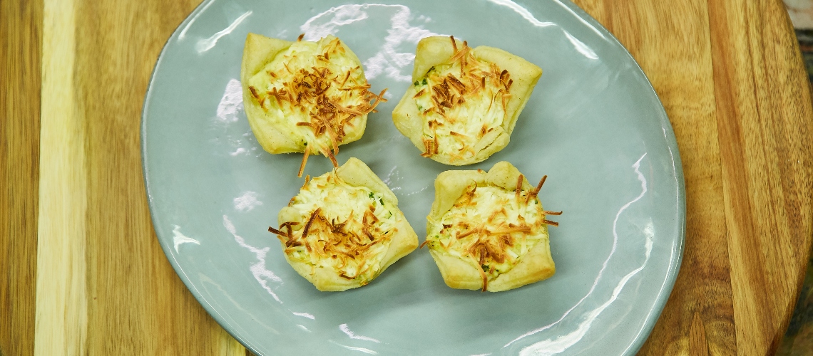 A kész leveles tésztát kockákra vágjuk, és kiolajozott vagy kivajazott muffinsütő formákba tesszük. Egy-egy kanálnyi orda-keveréket töltünk bele.