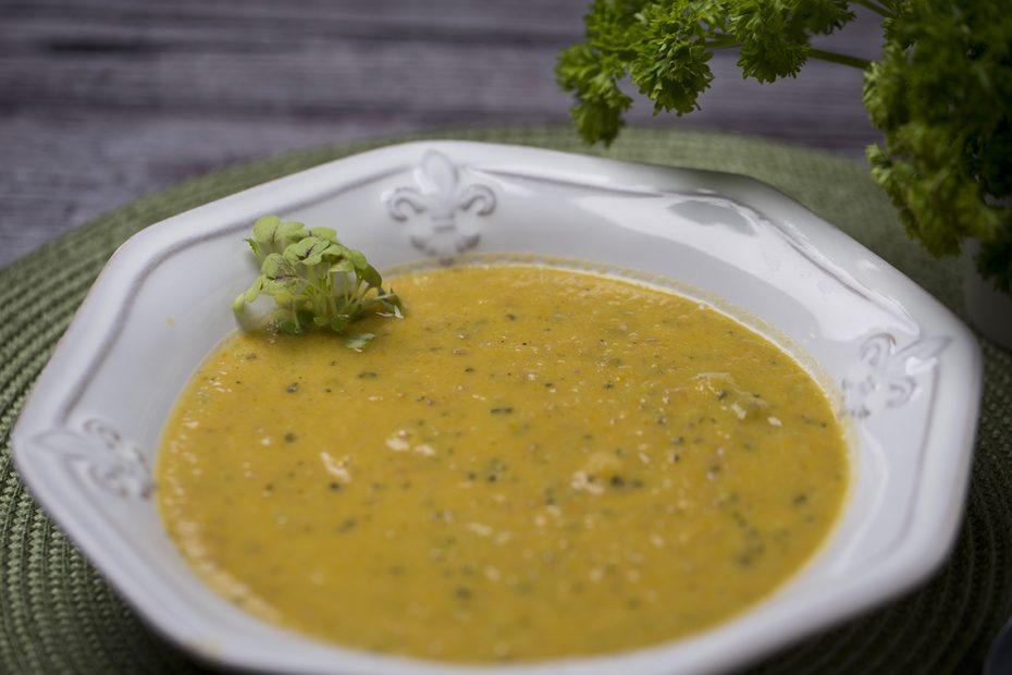 A vajon megfuttatjuk a hagymát, a fokhagymát, a sárgarépát, a krumplit, a cukkinit és a bacont, majd konyakkal flambírozzuk. Ezután felöntjük vízzel, és körülbelül egy órát főzzük. A végén összeturmixoljuk, és teszünk bele madras curry szószt.
