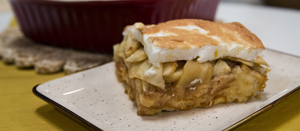 A kalácsot felkockázzuk. A 3 tojássárgáját kikeverjük a cukorral, majd a vajjal is. Hozzáöntjük a langyos tejet, rumot és ebbe szórjuk a kalácslkockákat. Vajazott, morzsázott sütőtepsibe öntjük a masszát. Az almát megtisztítjuk, felszeleteljük és a vajon megpároljuk. Hozzáadjuk a cukrot és a fűszereket. Nem kell hogy teljesen átpuhuljon. A kalácsos massza tetejére szórjuk a diót, majd az almát. 3o percig sütjük 175 fokon.