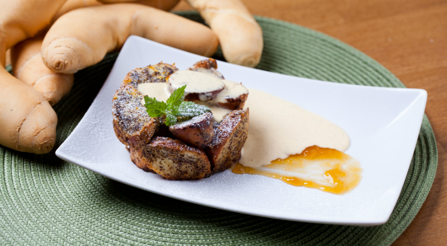 A kiflit karikára vágom, majd egy keverőtálba teszem mák, baracklekvár, citrom- és narancshéj kíséretében. Közben tejet melegítek, amibe beledobok egy rúd kikapart vaníliát. Kikeverek 3 tojássárgáját cukorral. Amint a tej meleg, egy merőkanállal öntök a fehérre kevert tojás-cukor kombinációhoz, hogy amikor átöntöm a tojást a tejbe, ne csomósodjon be azonnal. Ha a temperálás sikerült, alacsony hőmérsékleten, folyamatosan kavargatva, bevonóképes öntet állagúra főzöm. Ha ezzel megvagyok, a már a tálba készített gubára öntök belőle egy keveset. Most jöhet egy kevéske baracklekvár is. Elkeverem. Formázógyűrűbe teszem, majd sütőben 180 fokon megpirítom.