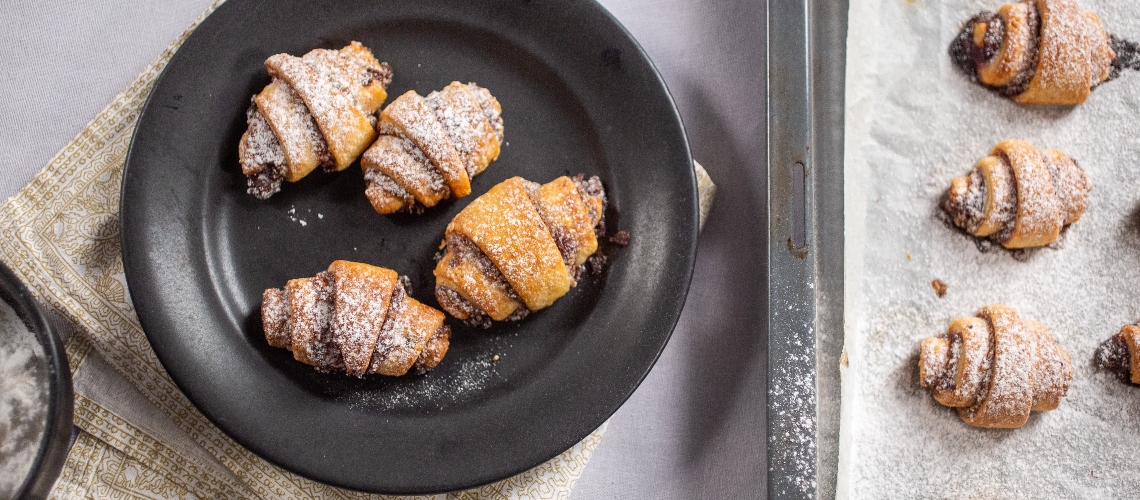 A krémsajtot gépben kikeverjük a vajjal és a cukorral. Eldolgozzuk benne a citromlevet és a vaníliát, majd a lisztet. Folpackba csomagoljuk, és legalább egy órára hűtőbe tesszük. Egy munkalapot kilisztezünk és kinyújtjuk a tésztát 5 mm vastagra. A tésztából egyforma, pizzaszeletszerű háromszögeket vágunk.