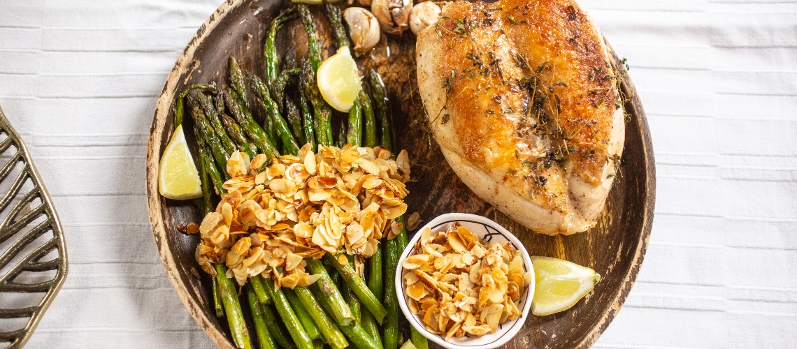 A sült spárgára kanalazzuk a vajas mandulát, felszeleteljük a csirkemellet és azonnal fogyasztjuk.