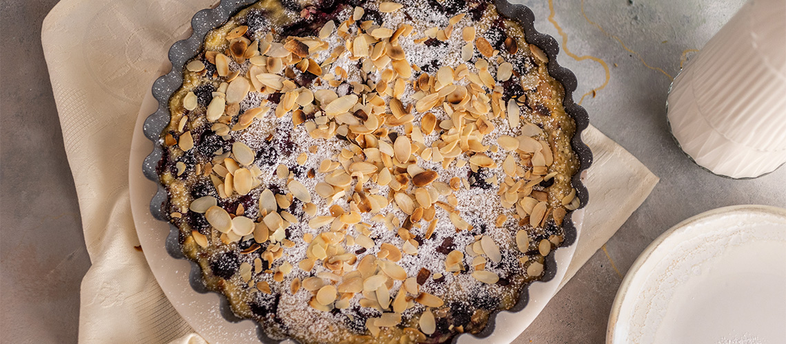 Egy kb. 22 cm-es sütőformát kivajazunk, beleszórjuk a kimagozott cseresznyét, és ráöntjük a mandulatejes keveréket. 185 fokra előmelegített sütőben 25 perc alatt készre sütjük.
