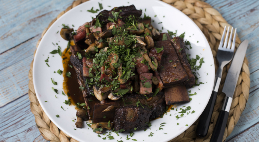 Egy vaslábasban felhevítünk az olajat. Az oldalast sózzuk, borsozzuk, és 10-15 perc alatt egyenletesen körbepirítjuk. Kiszedjük a húst, a fokhagymagumót keresztben kettévágjuk és vágott oldalával lefelé a lábasba tesszük. Hozzáadjuk a paradicsompürét és 1-2 percig pirítjuk. A húst visszatesszük a lábasba, felöntjük borral, felforraljuk, majd 10-15 percig főzzük, amíg a folyadék a felére sűrűsödik. Felöntjük annyi alaplével, ami majdnem ellepi a húst. Lefedjük, 160 fokra előmelegített sütőbe tesszük 3-4 órára, vagy amíg a hús omlósan megpuhul, és leválik a csontról. A sütési idő vége előtt tíz perccel a szalonnát 2-3 perc alatt aranyszínűre, ropogósra pirítjuk. Hozzáadjuk a gombát, és magas lángon lepirítjuk. Miután a hús elkészült, kivesszük és tálalóedénybe tesszük.