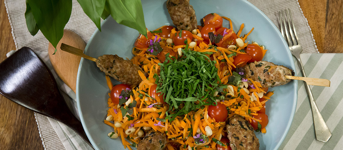 A sárgarépát durvára reszeljük, vagy julienne-re vágjuk. Kikeverjük az öntet hozzávalóit. Összeforgatjuk a répát, a koriandert, a paradicsomot, az öntetet, végül megszórjuk a korianderrel. (Hal, fasírt vagy sült csirke mellé is nagyon jó köret.)