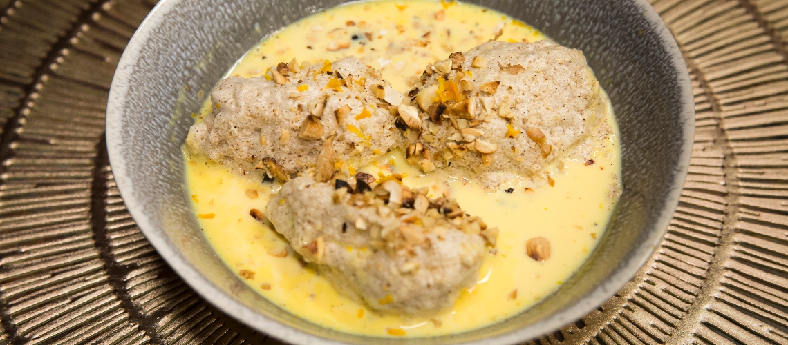 A felmelegedett tejbe két kanál segítségével hab-darabokat formálunk a felvert tojásfehérje-habból. Ha szükséges, a habot stabilizálhatjuk egy kis ecet vagy citromlé hozzáadásával.