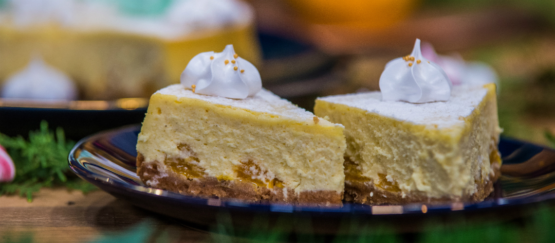 A kekszalapra rátesszuk a mandarinokat. A krémet a kekszrétegre öntjük, majd a 150 fokos sütőbe toljuk. Érdemes egy tepsiben vizet tenni a sütő aljába, ettől szebben sül.