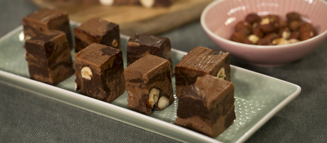 Gőz felett megolvasztjuk a vajat, a mogyorókrémet és a sűrített tejet. A keveréket kettéöntjük – az egyik felébe étcsokoládét, a másikba fehércsokit keverünk. Ezt felváltva elosztjuk egy kifóliázott (folpack), sütősprayvel befújt tepsire. Beleszórjuk a mogyorót, lenyomogatjuk az aljába. Min. 3 órára hűtőbe tesszük, utána szeletelhető.