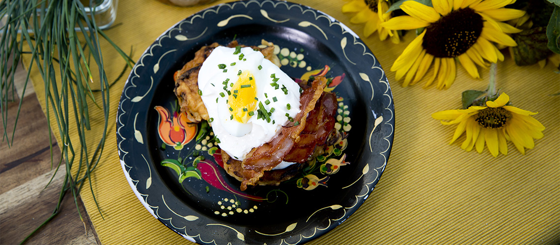Nagylyukú reszelőn lereszelünk 2-3 közepes tisztított burgonyát, majd megsózzuk.