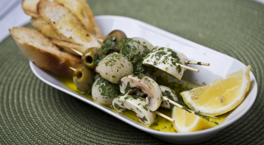 A gombafejeket enyhén ecetes sós vízben leforrázzuk (ha kicsik egészben hagyjuk, ha nagyobbak akkor felcikkezzük). Citromlevet friss petrezselyemmel, friss korianderrel összekeverünk, sózzuk, borsozzuk, majd felöntjük olívaolajjal. Ebbe az öntetbe tesszük a már előzőleg kivájt karalábégolyókat, a gombafejeket és az olívabogyót (pálcikára is szúrhatjuk őket). A végén citrommal tálaljuk.