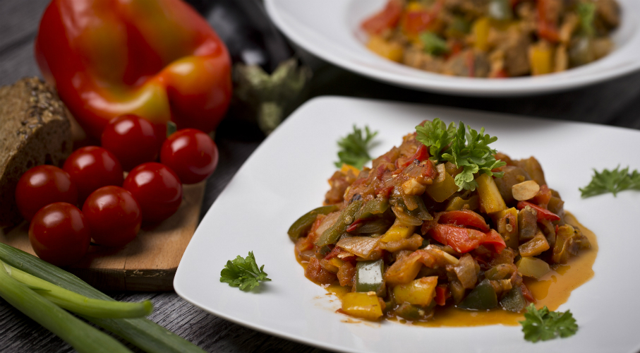 A padlizsánt meghámozzuk és felkockázzuk. A hagymát félbevágjuk, felkarikázzuk és kevés zsíron megfonnyasztjuk, hozzáadjuk a felaprított fokhagymát is. A tűzről levéve megszórjuk fűszerpaprikával.Beletesszük a felkockázott padlizsánt is. A kaliforniai paprikákat és a paradicsomot is felkockázzuk és a hagymás padlizsánhoz adjuk. Sózzuk. Összefőzzük és ízlés szerint tojással tálaljuk.