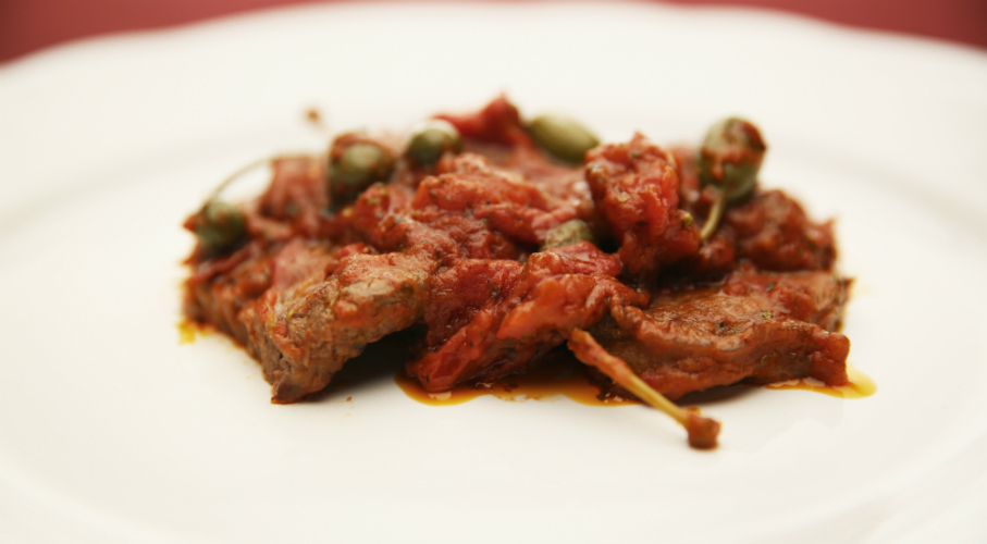 Egy serpenyőben felmelegítjük az olívaolajat, megpároljuk benne a fokhagymát. Amikor pirulni kezd, kivesszük a serpenyőből. Vékony szeletekre szeleteljük a borjúbélszínt, gyengéden kiveregetjük és lisztbe forgatjuk. Beletesszük a serpenyőbe, és ízlés szerint sózzuk, borsozzuk. Hozzáadjuk a hámozott paradicsomot egészben, megszórjuk oregánóval, és belerakjuk a kapribogyót is. Addig hagyjuk készülni, amíg a borjúszeletek mindkét oldala megsül, utána kivesszük. Melegen tálaljuk a tetejére szedett paradicsommal és kapribogyóval.