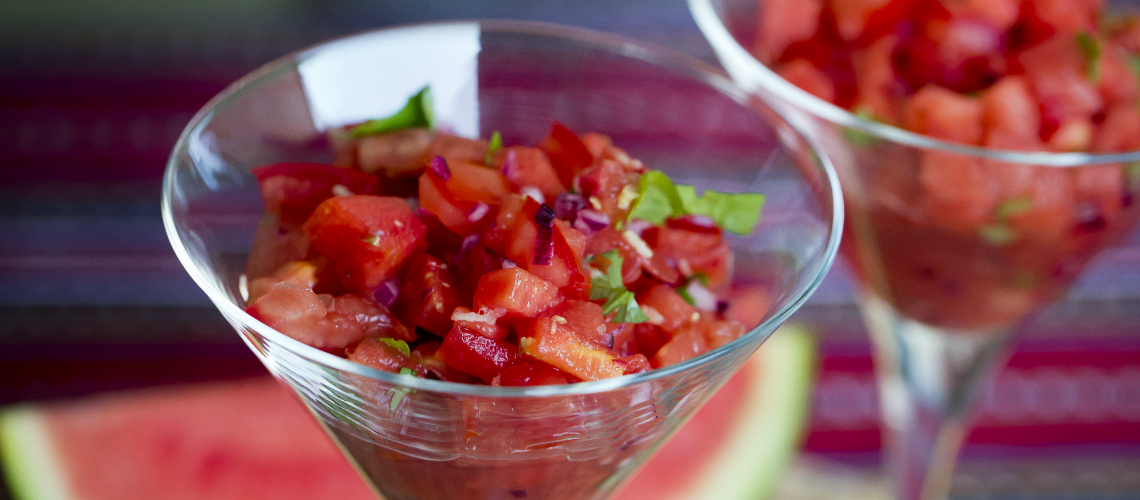 A dinnyét kimagozzuk, és apró kockákra szeleteljük, összekeverjük a felkockázott paradicsommal, majd hozzáadjuk a lilahagymát. Összekeverjük a zöldcitromlevet, a chilit és a gyömbért. Ráöntjük a dinnyére, végül hozzáforgatjuk a friss korianderzöldet.