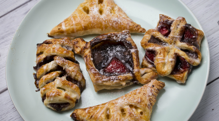 Olívabogyót, szárított paradicsomot, kevés olajat, feta sajtot és egy gerezd fokhagymát pépesítünk. sóval, borssal, petrezselyemmel ízesítjük. A kihajtogatott leveles tésztából köröket szaggatunk, amire halmozunk a töltelékből. A tészta szélét megkenjük tojással. Megsütjük. A leveles tésztából kis négyzeteket vágunk ki, megkenhetjük lekvárral, rápakoljuk az almaszeleteket és félbehajtjuk. Megkenjük tojással és sütőben megsütjük 185 fokon 20-30 percig.