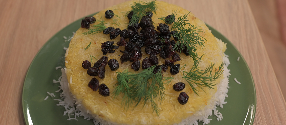 A rizst alaposan átöblítjük – sokszorosan, amíg teljesen áttetszővé válik a víz. Fél órára langyos vízbe áztatjuk. Egy nagy lábasban vizet forralunk, sózzuk, a rizst ebben kb. 8 perc alatt al dente állagúra főzzük – közepe még legyen kemény, de a külső felülete puha. Közben néhány evőkanál forró vízbe áztatjuk a sáfrányt (amit előtte érdemes kissé megtörni, porítani). A rizst leszűrjük. Kiválasztunk egy megfelelő lábast – alacsonyabb peremű a legjobb, aminek füle is van, mert a végén könnyebben tudjuk majd kiborítani. Az előfőzött rizs kétharmadát összekeverjük a kiáztatott sáfránnyal és néhány kanál olajjal. A lábast felhevítjük, olajat öntünk bele, majd hozzáadjuk a sáfrányos rizst, és alaposan lenyomkodjuk. Erős lángon pirítjuk pár percig, nem kevergetjük. A rizs másik részét lazán ráhalmozzuk. Fakanál végével kis „alagutakat” fúruk bele, és ebbe kis darab vajakat teszünk. A lábas fedelét bebugyoláljuk tiszta konyharuhába és szorosan lefedjük a lábast, itt az a cél, hogy a rizst már csak gőzöljük. Kb. 25 percig, alacsony hőfokon gőzöljük. 10 percig pihentetjük, majd határozott mozdulattal egy tálra borítjuk. Serpenyőben vajat olvasztunk, ezen átforgatjuk az aszalt meggyet, a rizs tetejére halmozzuk, majd friss kaprot teszünk rá.