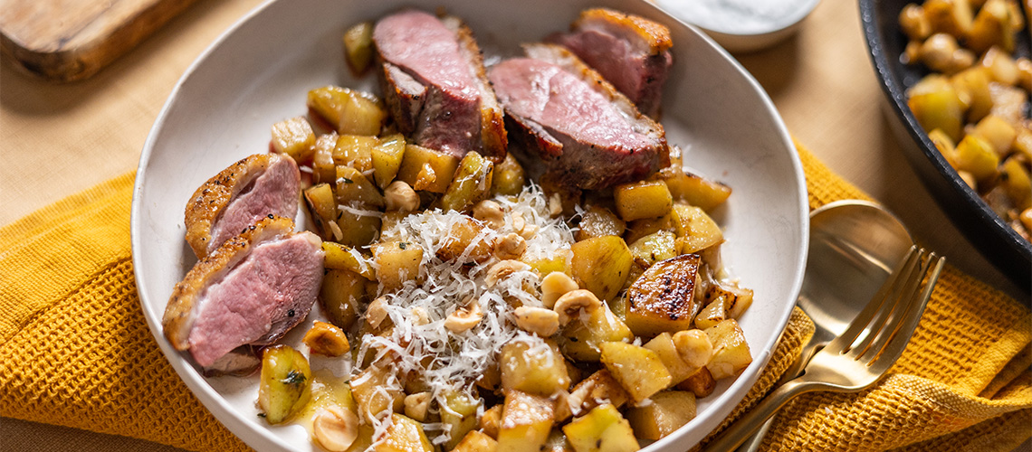 A kacsamelleket felhasználás előtt 30 perccel kivesszük a hűtőből. Éles késsel beirdaljuk rajta a bőrt, gazdagon sózzuk, borsozzuk mindkét oldalán. Bőrös oldalával lefelé egy nagy serpenyőbe tesszük, amiben kényelmesen elférnek a mellek, és a tűzhelyen közepesen erős láng felett, fedő alatt elkezdjük sütni. 7 perc után átfordítjuk és további 2-3 percig sütjük. Áttesszük egy hőálló edénybe, és 180 fokra előmelegített sütőben 7 percig sütjük.