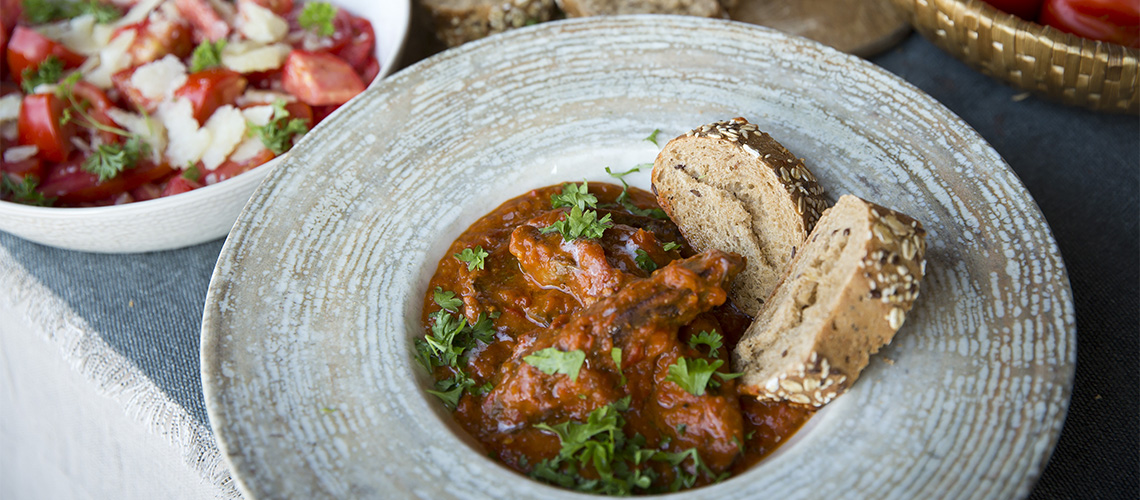 Saláta: Feldaraboljuk a paradicsomot és a feldarabolt sajtot rászórjuk, olívaolajjal meghintjük, enyhén sózzuk és petrezselyemmel díszítjük.
