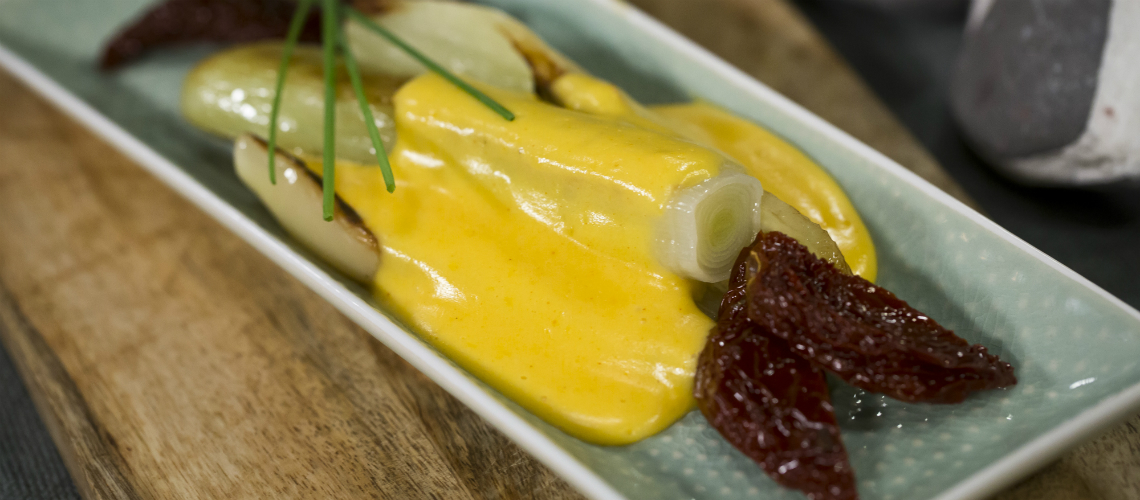 Tálalás előtt a póréhagymát a felezett, csíkozott paprikákkal együtt hirtelen megpirítom, majd a hollandi mártással leöntve, aszalt paradicsommal tálalom.