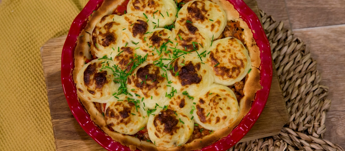 A húst ledaráljuk. Megpirítjuk a hagymát. Lereszeljük az édesköményt és a gyökérzöldségeket, amiket hagymához keverjük, majd hozzáadjuk a húst és a paradicsompépet is. Beforraljuk. Hideg vajból és lisztből sima tésztát gyúrunk, amivel a piteformát kibéleljük. Néhány perc alatt elsősütjük, majd beletöltjük a ragut. Vajas krumplipürét készítünk, amit habzsákkal a húsra nyomunk: 220 fokon 10 perc alatt készre sütjük.