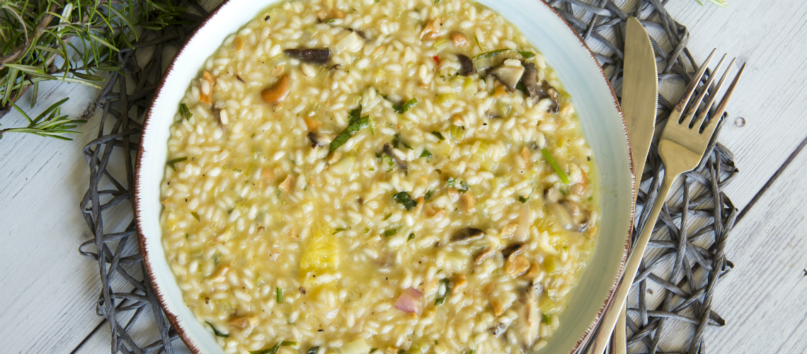 Ha a rizottó a kívánt állagú, tegyük bele a narancsot, valamint gomba és zeller keverékét, vajat, sajtot és keverjük össze, hogy a rizs a kívánt állagú legyen.