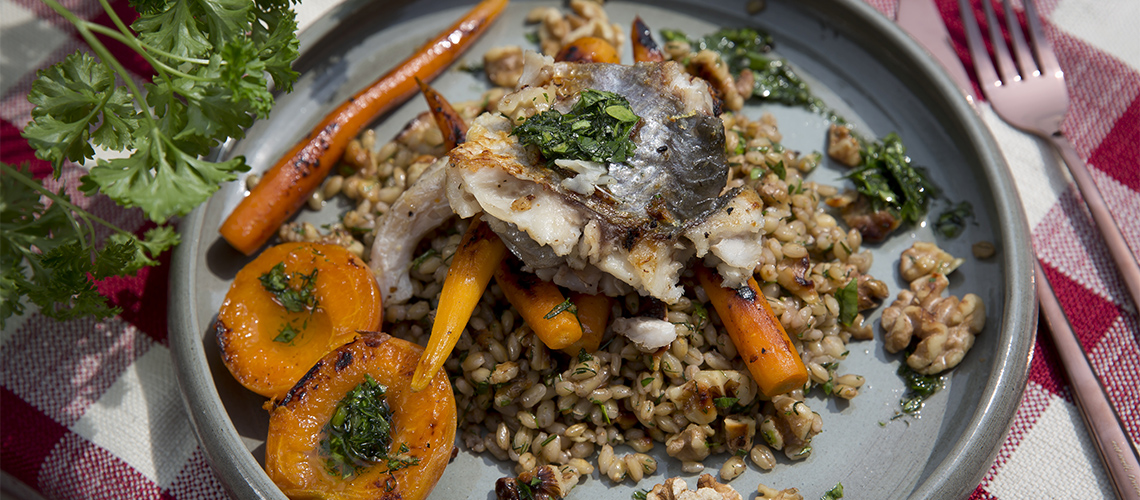 Tálalás: a gerslire helyezzük a répát, rá a halszeleteket, pasztát, diókat, kis sót és mellé jönnek a barackok.